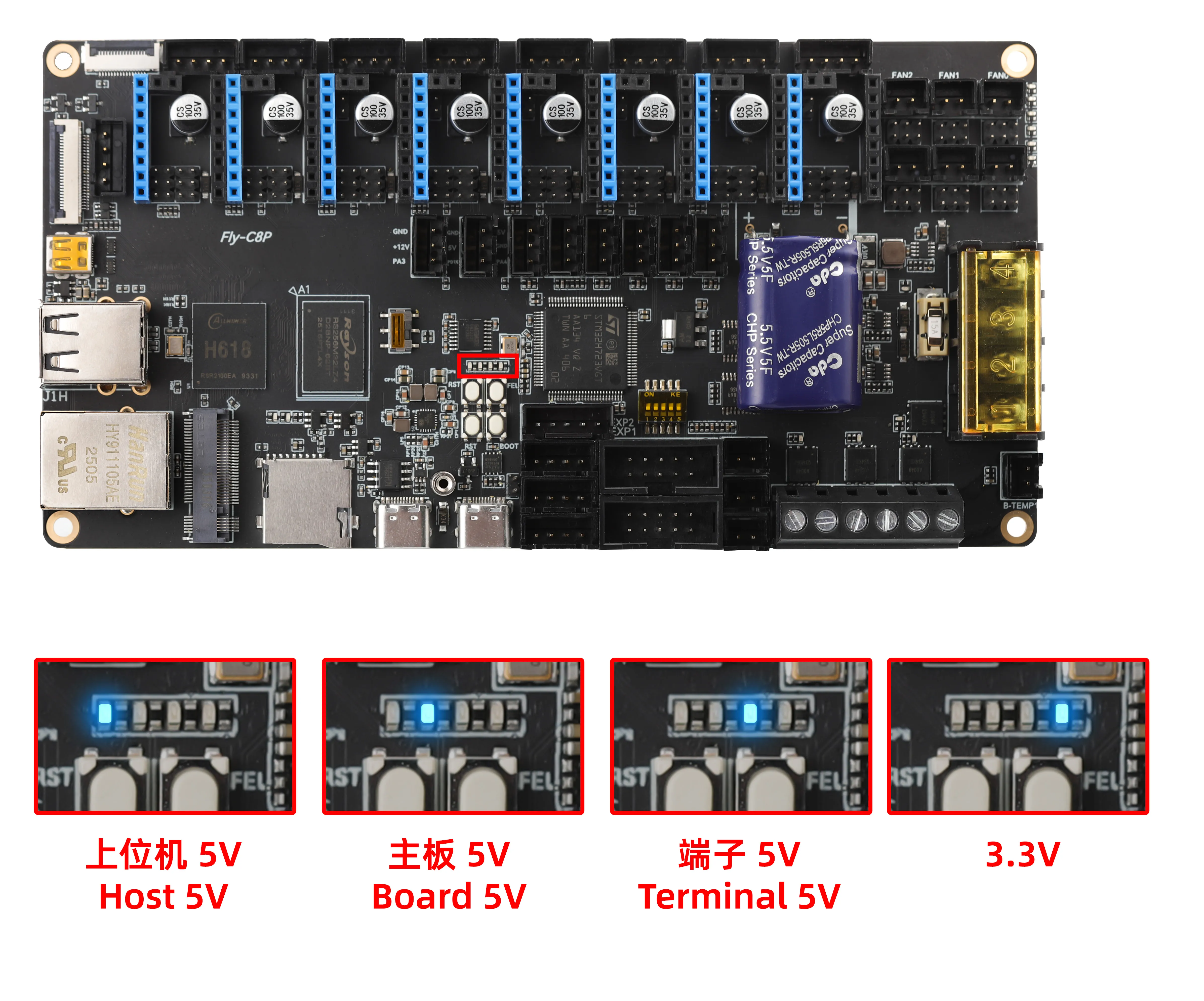 主板类FLY-C 系列主板FLY-C8P主板注意事项本页总览主板注意事项 电源指示灯 问题排查 须知 在没有任何外接设备情况下(驱动、限位、12864等) 只通过TYPE-C供电至少会常亮3.3V 如果接上主板电源与驱动电源后5V灯不亮,需要联系客服售后 驱动 主板支持外置驱动 接线与配置教程 限位口 请注意接线顺序,三线限位需要注意5V、GND、S这三个如果接错很可能导致主板损坏 如果两线直接接S与GND即可 PL08与其他接近开关需要在信号口外接二极管将电压降低到3.3V以下 Loading...
