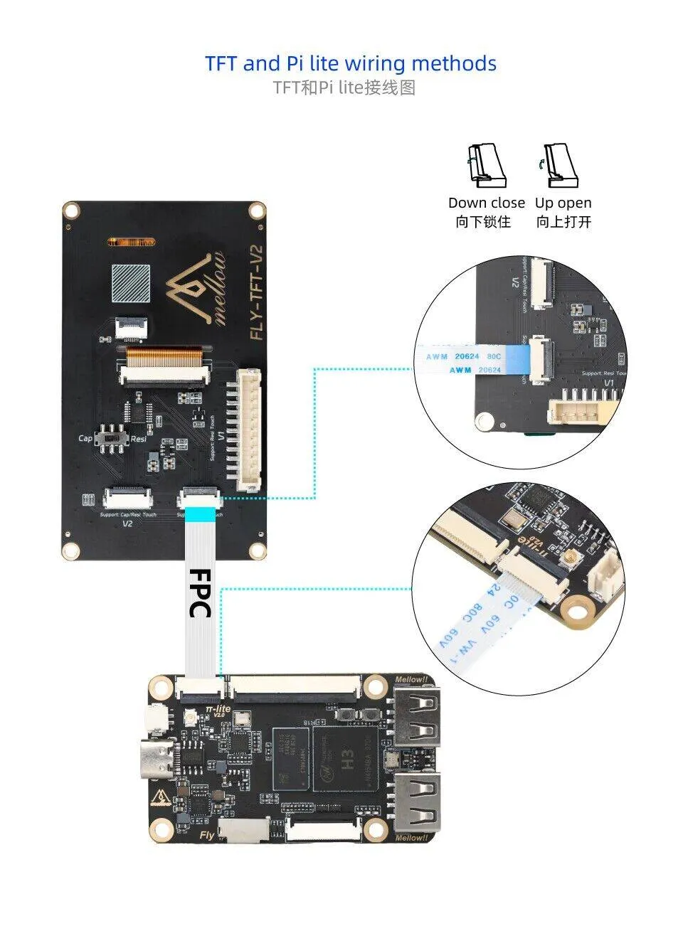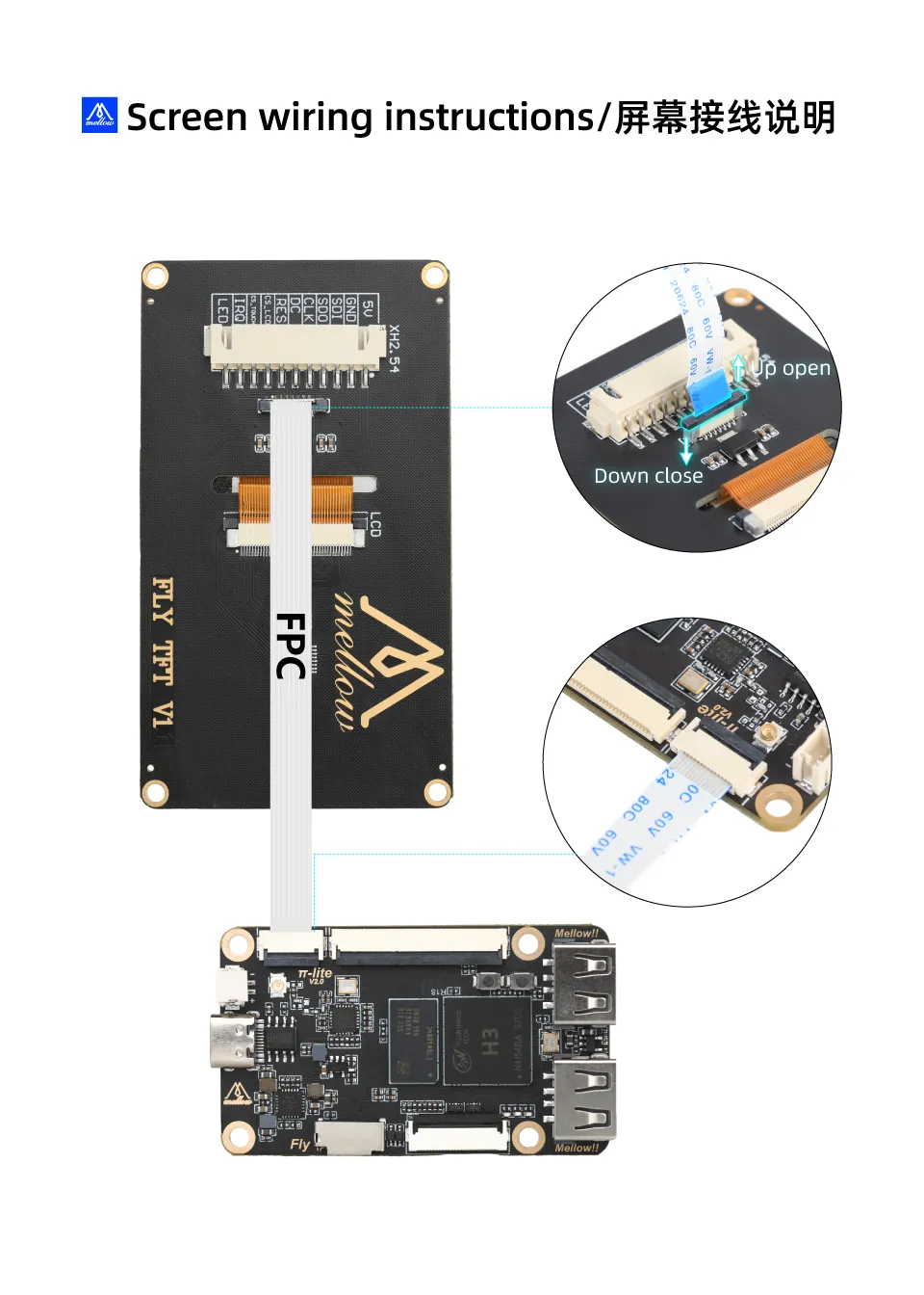 • TFT屏幕接线时请仔细确认FPC排线的插入方向,避免排线反接导致设备故障