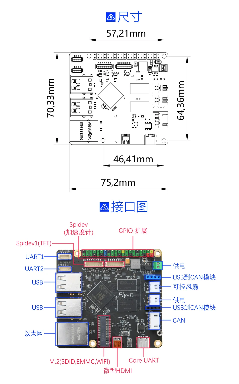 • 接口:板载M.2接口,可扩展WIFI,eMMC等。(私有协议,切勿连接非FLY π专用的M.2设备)