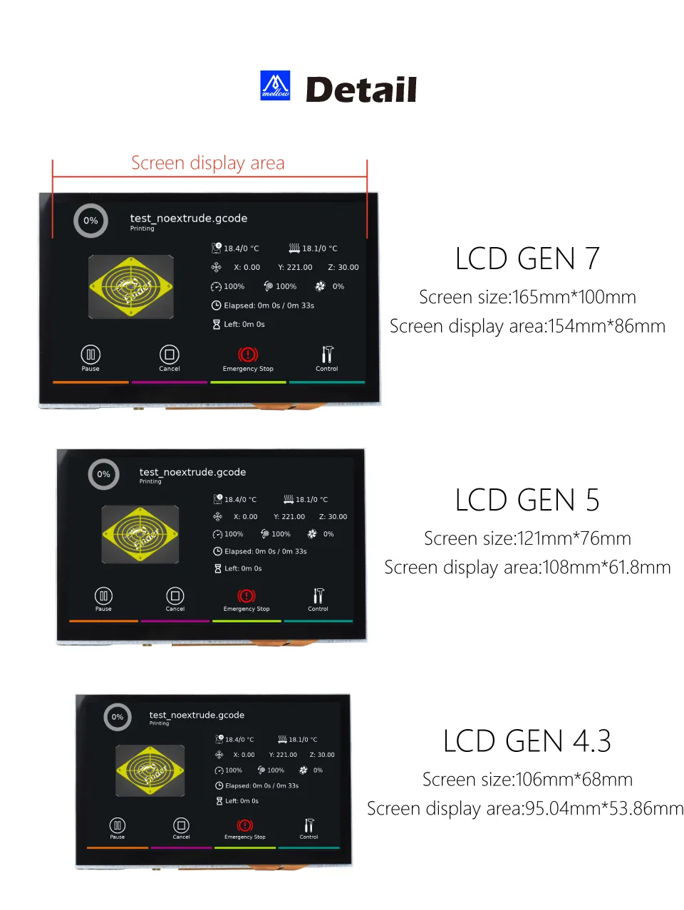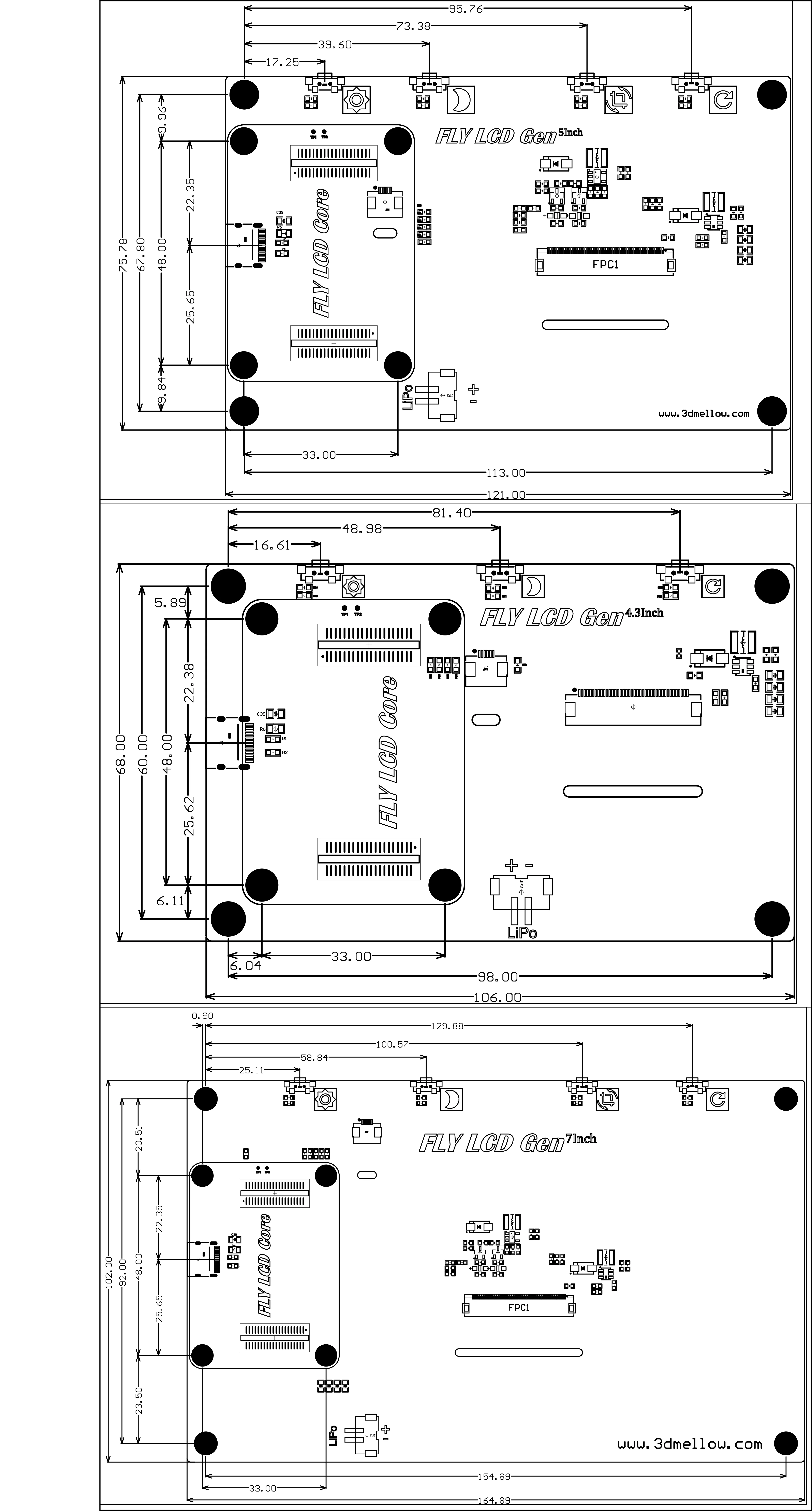 显示屏类FLY-LCD系列简介本页总览简介 分体式设计,支持多种核心板DSI与HDMI 多种尺寸,4.3英寸,4英寸,7英寸 高清分辨率,不错过每一个细节 支持10级亮度调节 支持180°屏幕翻转 注意事项七寸屏幕适用HDMI核心板无法选择,DSI核心板正常控制 产品尺寸 Loading...