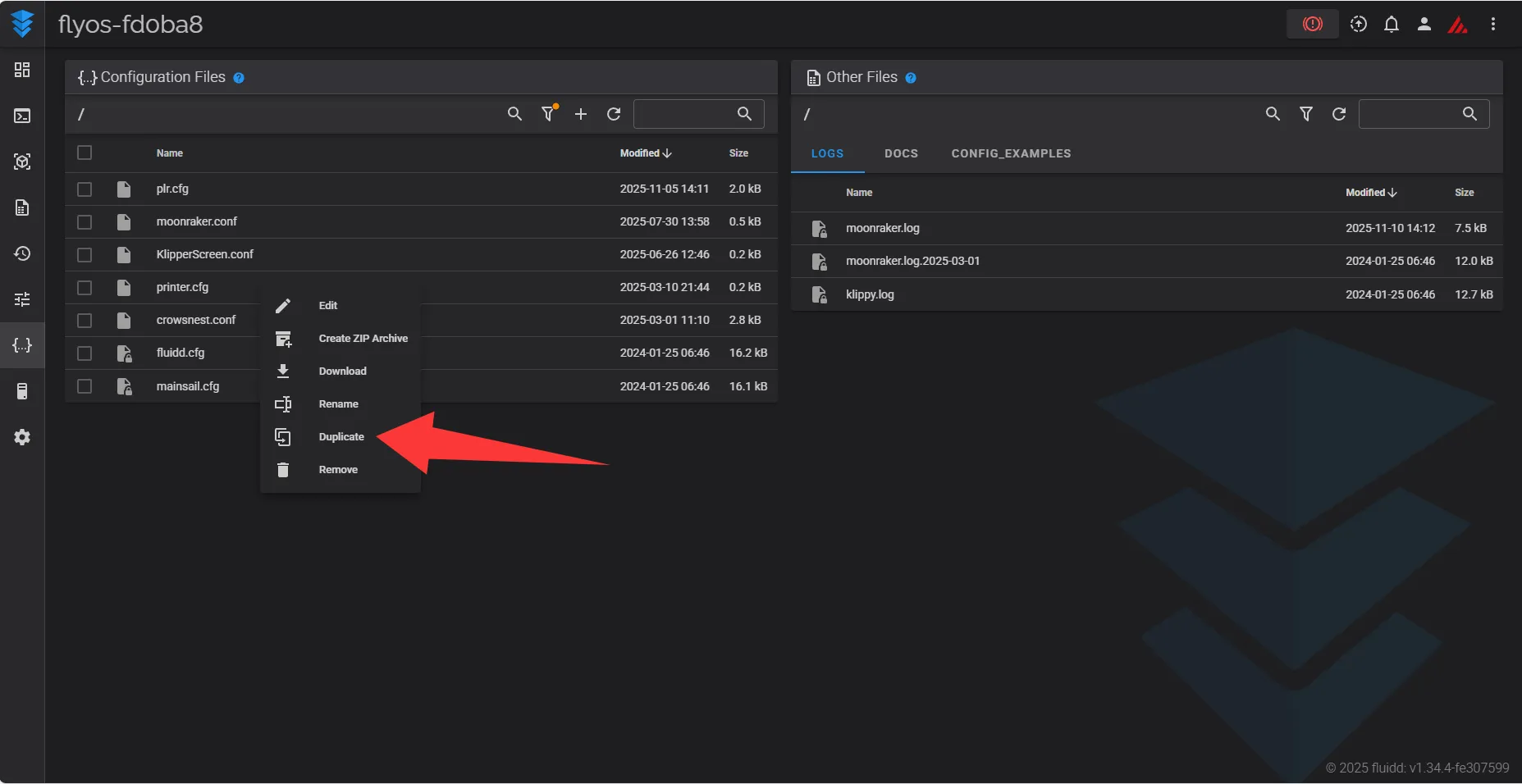 Right-click on the printer.cfg file, select Duplicate to copy it, and rename the copy to: