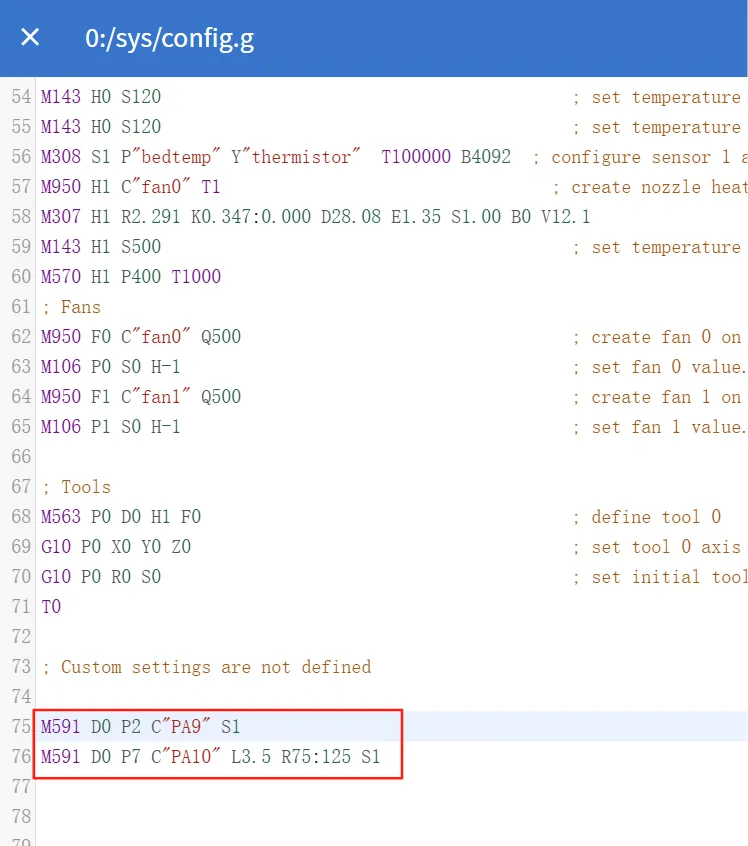 2. Add the following code in the file to enable filament out detection.