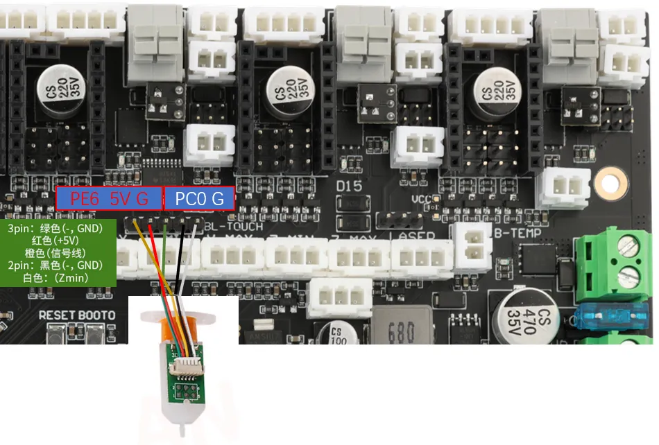 BL-Touch has five wires in total. The first group of three wires is responsible for sensor power and probe deployment/retraction. The second group consists of ground and signal wires, outputting the limit signal. When wiring BL-Touch, carefully verify the wire order. Incorrect wiring may permanently damage the sensor and motherboard!!! The wiring method is shown below.
