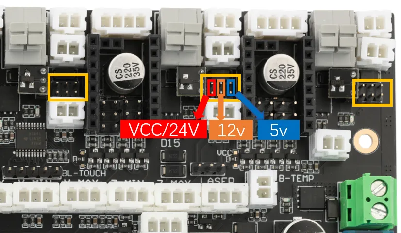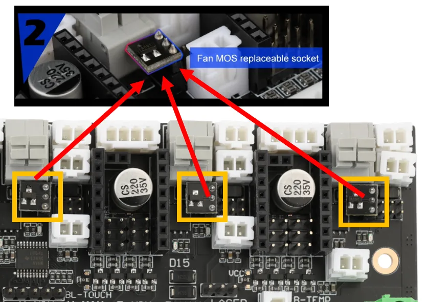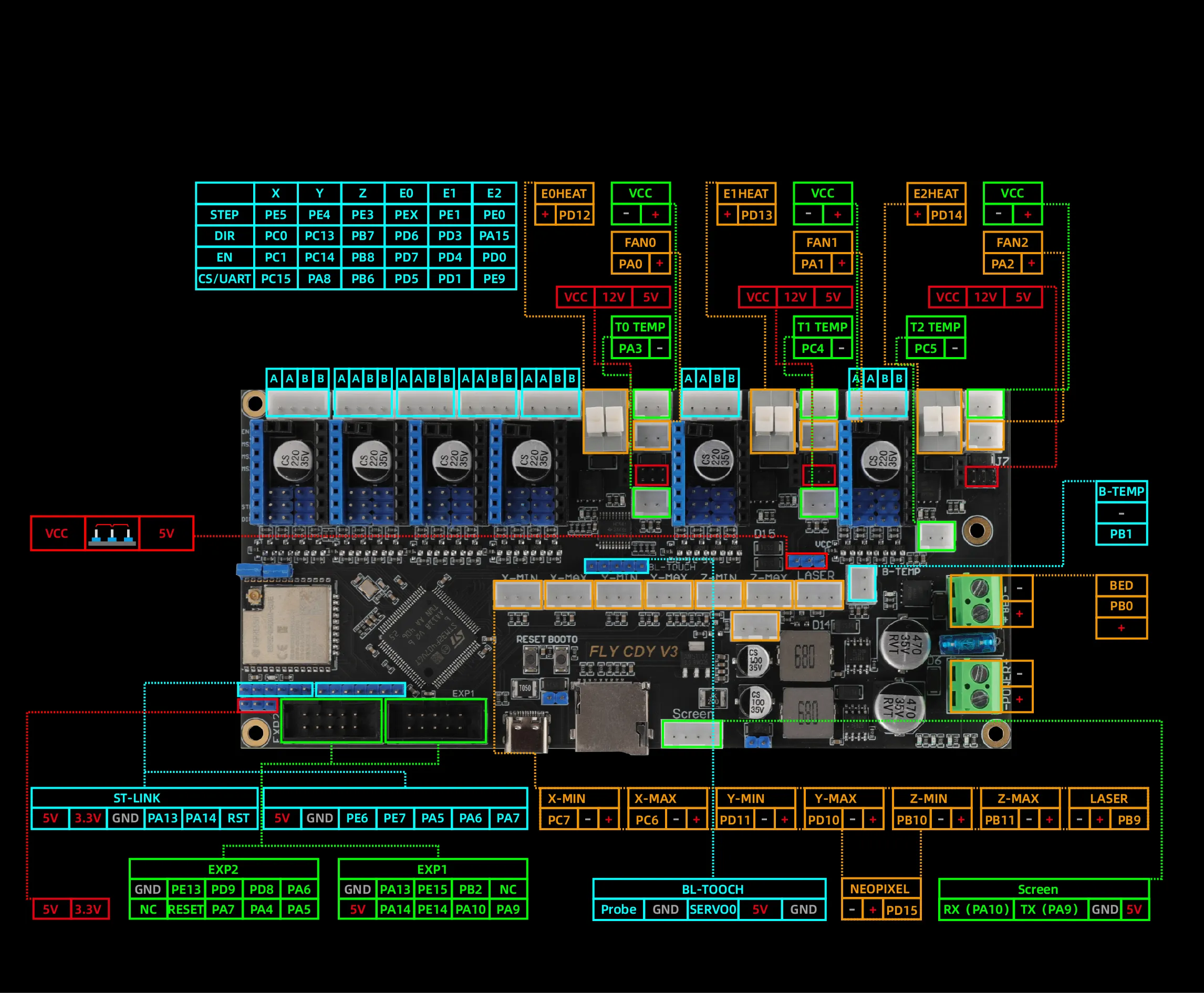 DC Heated Bed: When using the onboard MOSFET for a DC heated bed, pay attention to the power rating. The maximum current for a DC heated bed should not exceed 10A. If exceeding 10A, it is recommended to use an external MOSFET module for the heated bed to avoid irreversible damage to the motherboard.