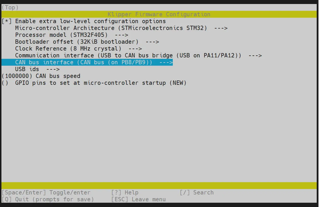 cd ~/klipper && rm -rf ~/klipper/.config && rm -rf ~/klipper/out && make menuconfig