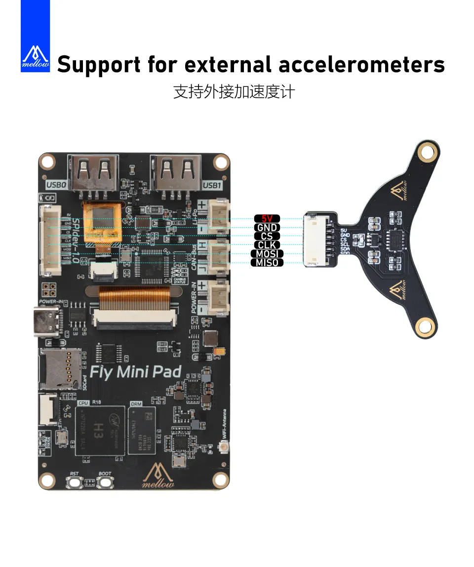 • The Mini Pad can directly connect an accelerometer via the onboard interface or use a toolboard with an integrated accelerometer