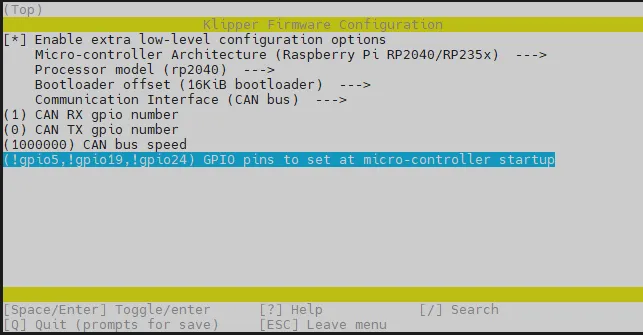- Select GPIO pins to set at micro-controller startup, enter: !gpio5,!gpio19,!gpio24