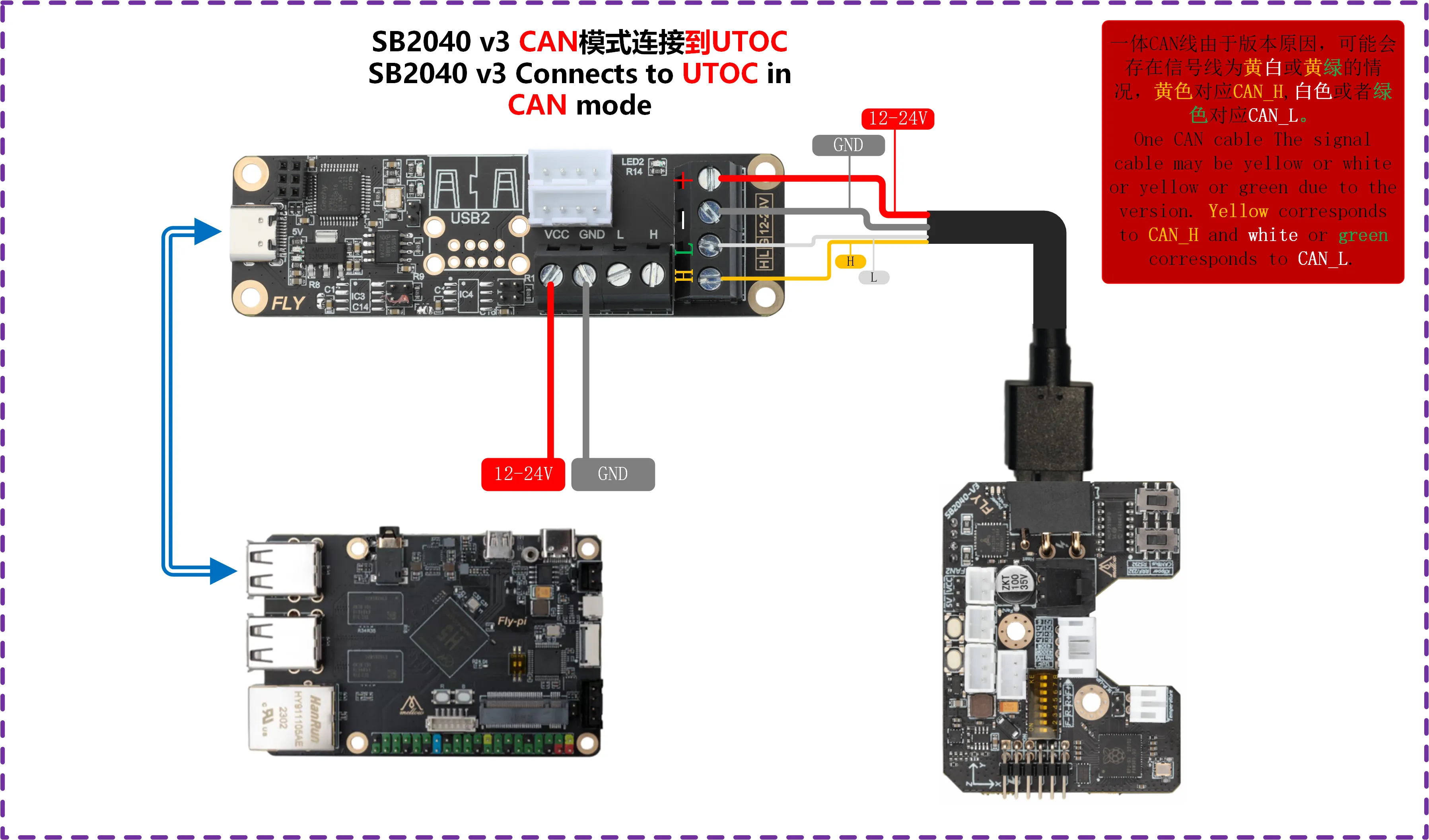 Before flashing the firmware, use an XT30 data cable to connect the tool board to UTOC or a mainboard with bridging firmware, the following is a reference wiring diagram