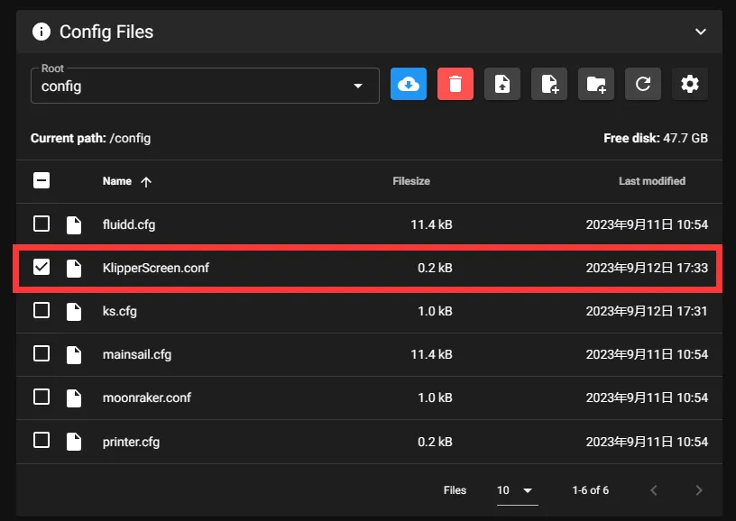 KlipperScreen.confdans les paramètres de l'imprimante, ce fichier est généré automatiquement après l'installation de KlipperScreen. Si vous ne l'avez pas, créez-le vous-même.