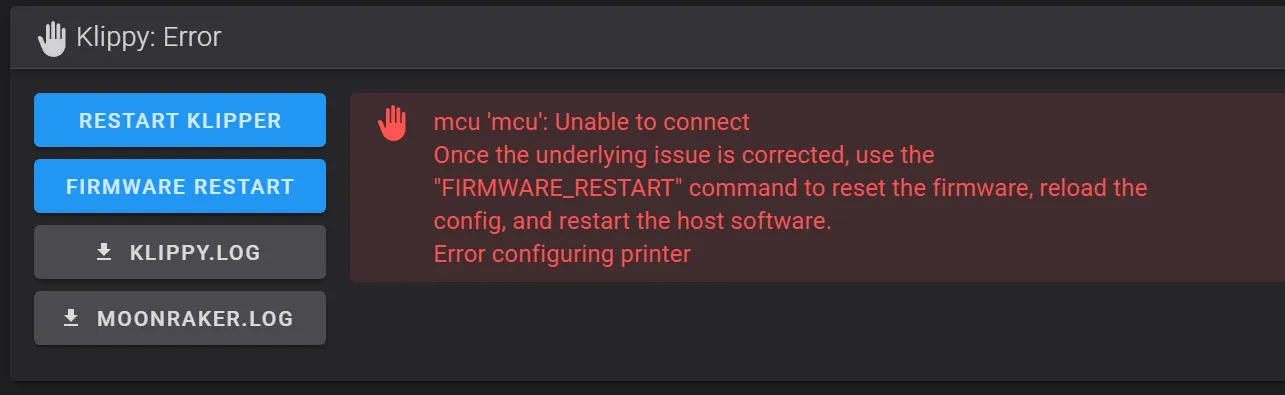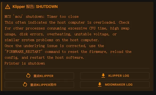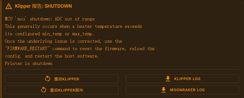 - Klipper détecte une température dépassant les seuils maximaux ou minimaux (le thermistance peut être ouvert ou court-circuité), le système entre alors en mode de protection par arrêt.