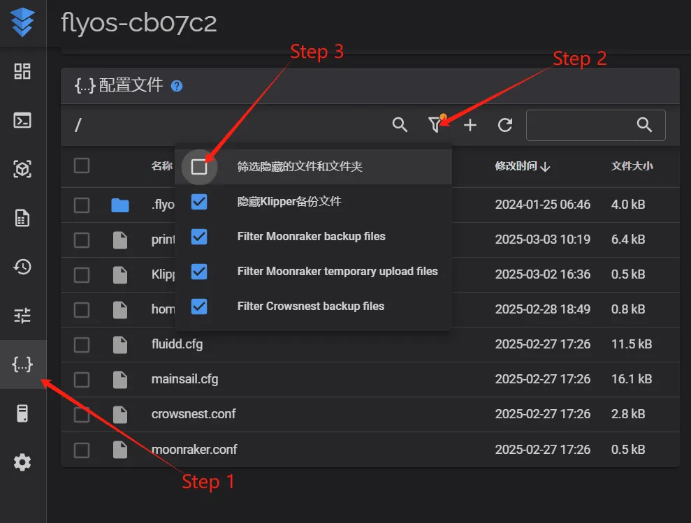 fluidd, comme indiqué sur l'image de gauche ci-dessous, décochez l'optionCacher les fichiers et dossiers. - Sous