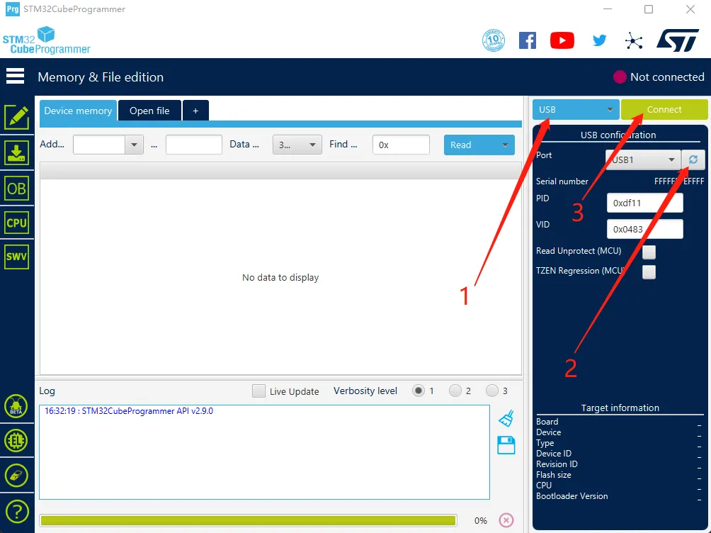 dfu - Dans STM32CubeProgrammer, sélectionnez le mode USB, puis actualisez et connectez