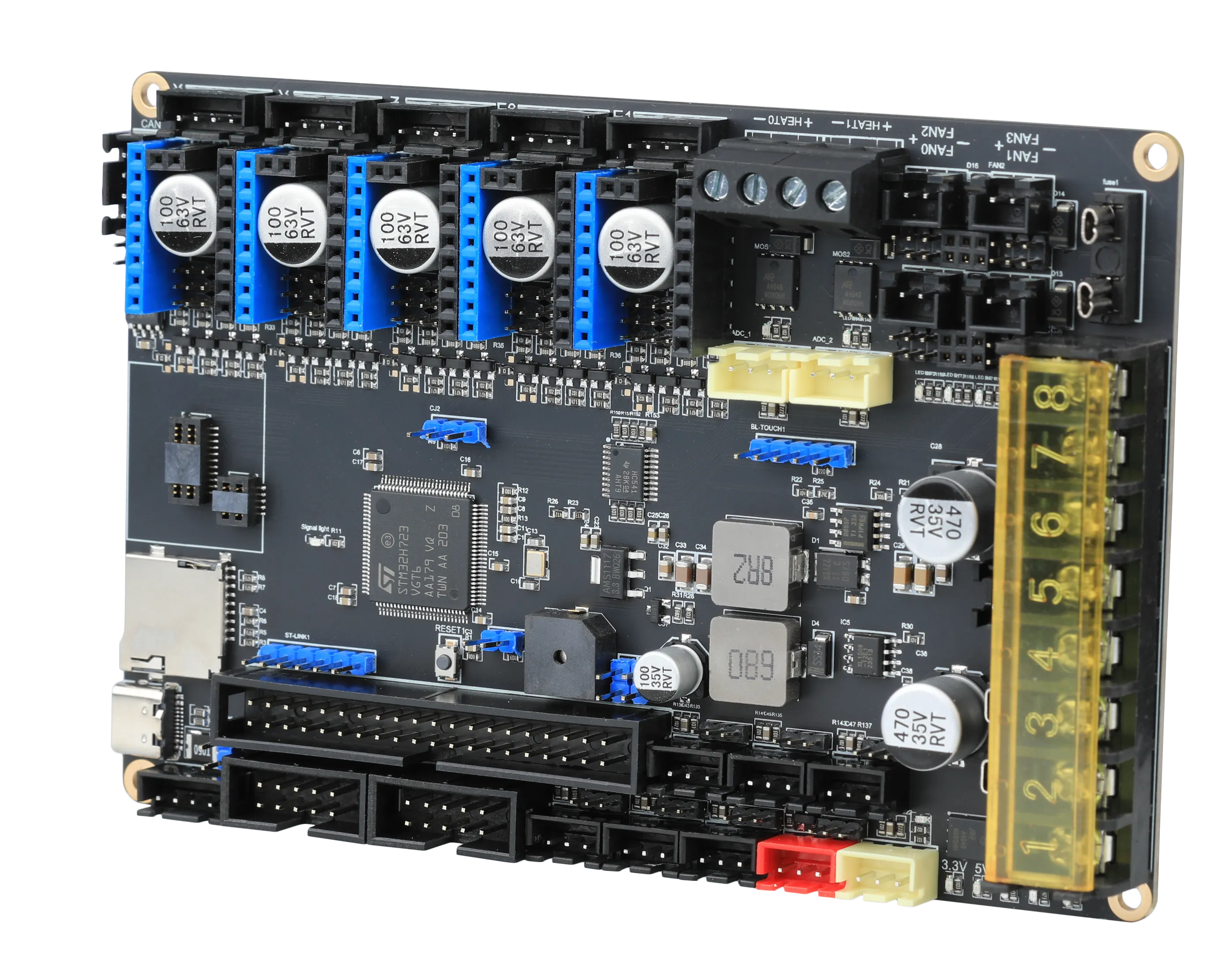 - 1 port haute tension IN, supportant les capteurs d'auto-nivellement : BLTouch, capteurs de proximité PL08N, Klicky, Voron Tap, etc.