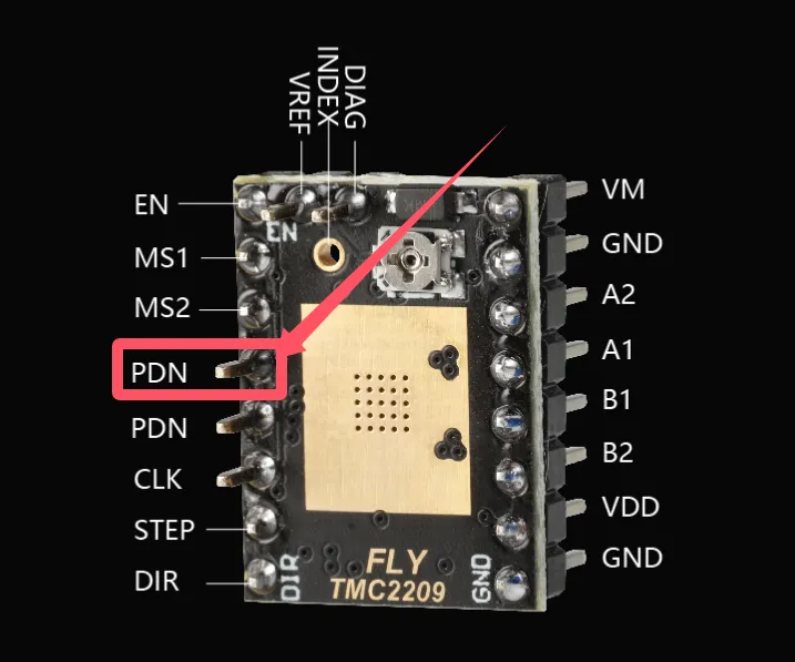 Les broches UART du pilote FLY sont la quatrième broche à partir de la gauche, la broche PDN est la même que la broche UART. Si la carte mère n'a pas la bonne broche, le mode UART ne peut pas être utilisé