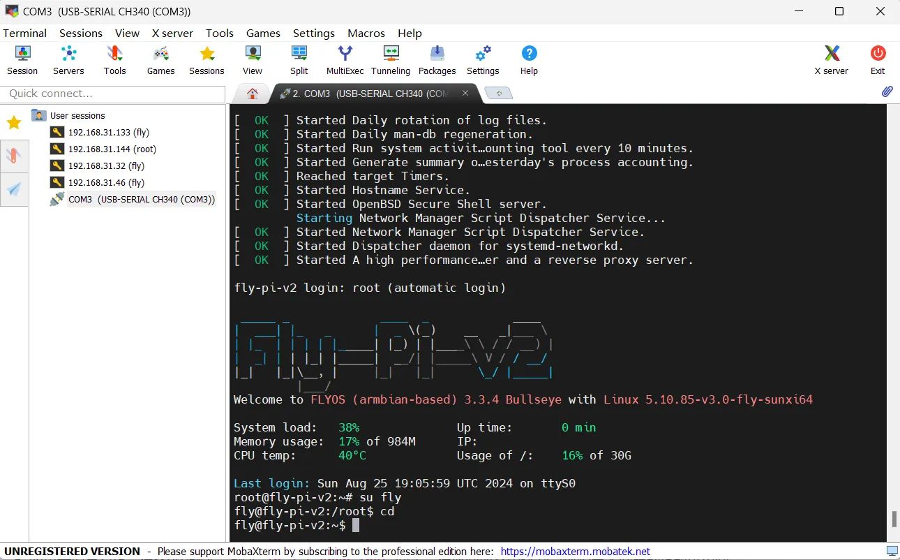 1. Connectez-vous d'abord à l'hôte via un port série : FLYOS-Armbian Connexion série avec l'hôte par ssh
