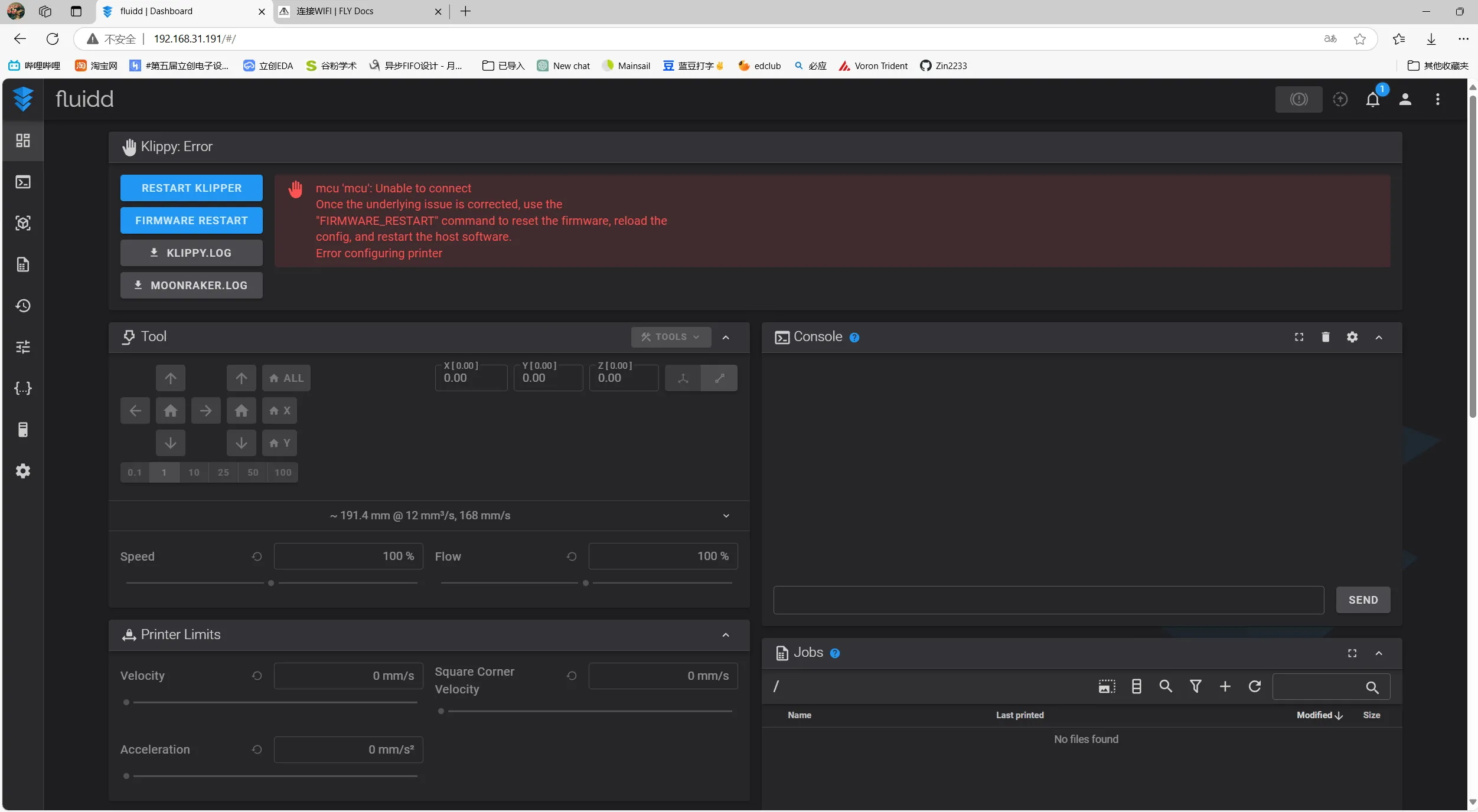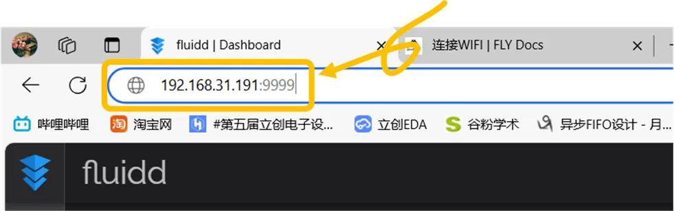 1. Ouvrez un navigateur et entrez dans la barre de recherche l'IP de l'hôte que vous venez de trouver, puis appuyez sur Enter pour accéder à la console web Fluidd/Mainsail