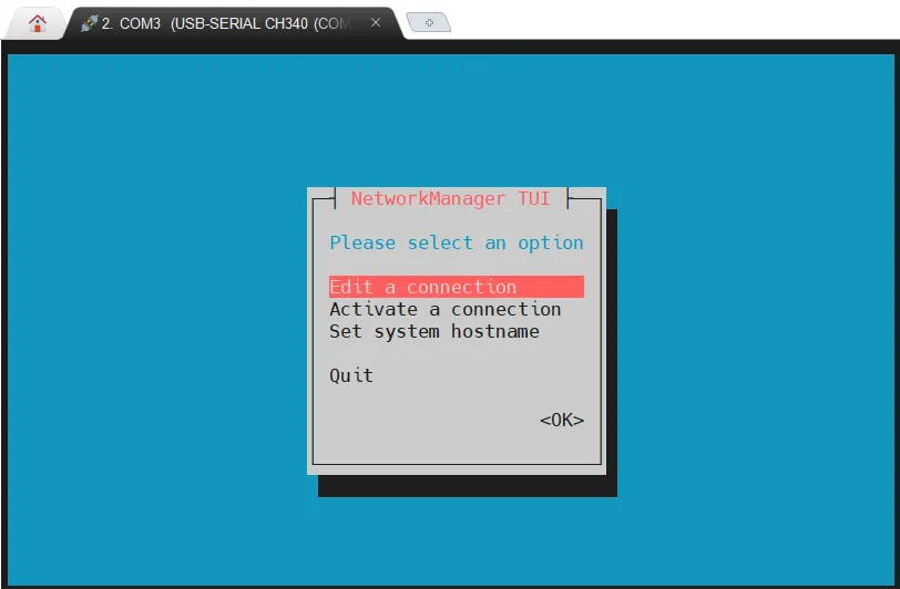 2. Entrez la commande sudo nmtui. Vous serez peut-être invité à saisir un mot de passe. Entrez le mot de passe mellow puis appuyez sur la touche Enter. Une interface similaire à celle illustrée ci-dessous s'affichera (Veuillez noter que le mot de passe saisi ne sera pas visible)