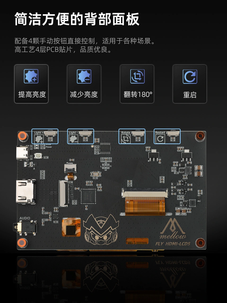 • Ce dispositif adopte un design unique de port FPC (circuit imprimé flexible), qui peut être directement connecté à la carte mère de l'hôte conçue par Fly, sans avoir besoin de câbles HDMI et USB. Cette connexion FPC simplifiée réduit l'encombrement des câbles et garantit une interface propre et efficace. Malgré l'utilisation de cette méthode de connexion avancée, le dispositif conserve également un port HDMI standard pour les utilisateurs préférant les options de connexion traditionnelles. En plus de sa flexibilité en termes de connectivité, ce dispositif inclut également des touches intelligentes permettant un réglage facile de la luminosité, de la rotation de l'écran et du redémarrage. Un adhésif en mousse importé de haute qualité assure une forte adhérence de l'écran et une durabilité excellente. La technologie de dissipation thermique à double face et à faible résistance améliore la sensibilité tactile, offrant ainsi une expérience utilisateur plus fluide. La technologie de lumière jaune assure une restitution précise des couleurs avec une luminosité standard de 500, évitant toute surexposition. L'écran est protégé par un verre trempé de haute résistance, garantissant une protection solide contre les dommages. Ce dispositif est entièrement compatible avec des systèmes hôtes tels que le Raspberry Pi. Il adopte également un design de port HDMI caché, permettant de dissimuler soigneusement le câble derrière l'appareil pour un aspect propre et professionnel. Son circuit haute performance garantit un fonctionnement sans à-coups, en faisant un choix idéal pour les imprimantes 3D exigeant une performance stable et fiable.