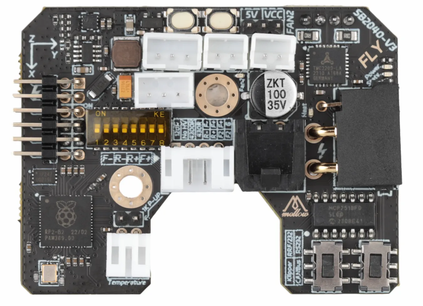 La FLY SB2040 V3 est une carte outil développée par Guangzhou Meilun Electronic Technology Co., Ltd. pour la tête d'impression VORON Stealthburner. Cette carte permet de remplacer le câblage complexe entre la carte mère et la tête d'impression par seulement quatre fils, optimisant ainsi la disposition. La SB2040 est compatible avec les modèles Stealthburner et Afterburner. Il s'agit d'une carte outil intégrant un transceiver CAN, un transceiver RS232, un port USB, un pilote TMC2209, un accéléromètre LIS2DW, trois ventilateurs contrôlables et d'autres fonctionnalités. Cette carte outil est compatible avec les firmwares Klipper et RRF.
