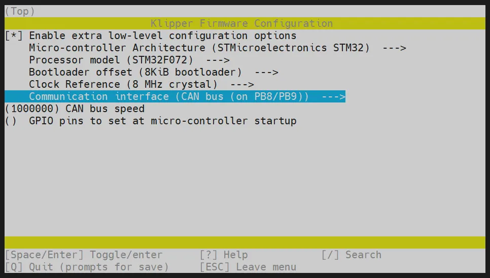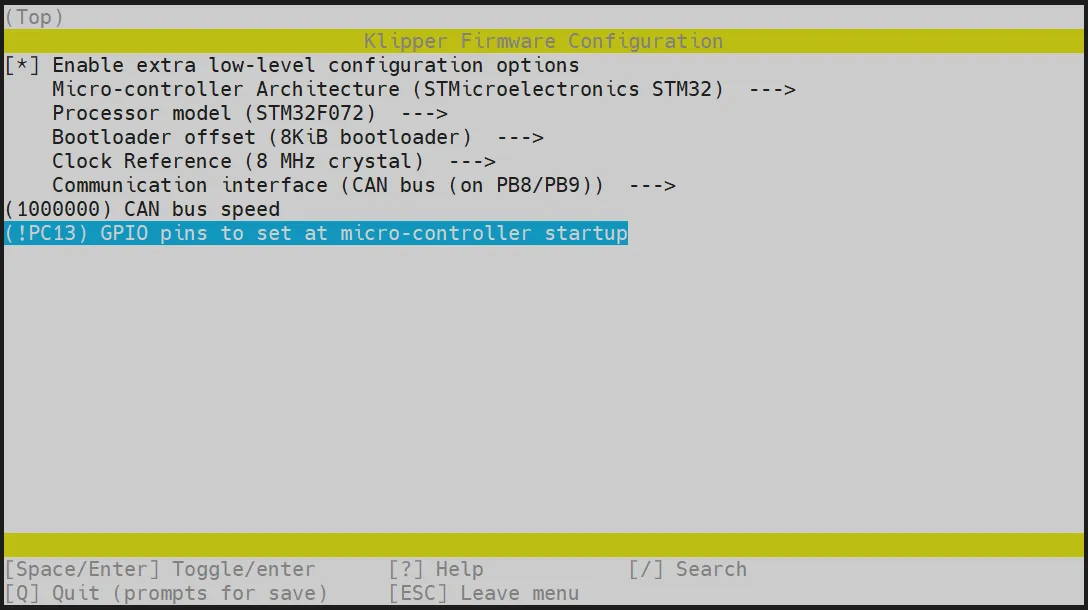 4. La touche Q permet de quitter la page de configuration du firmware Klipper