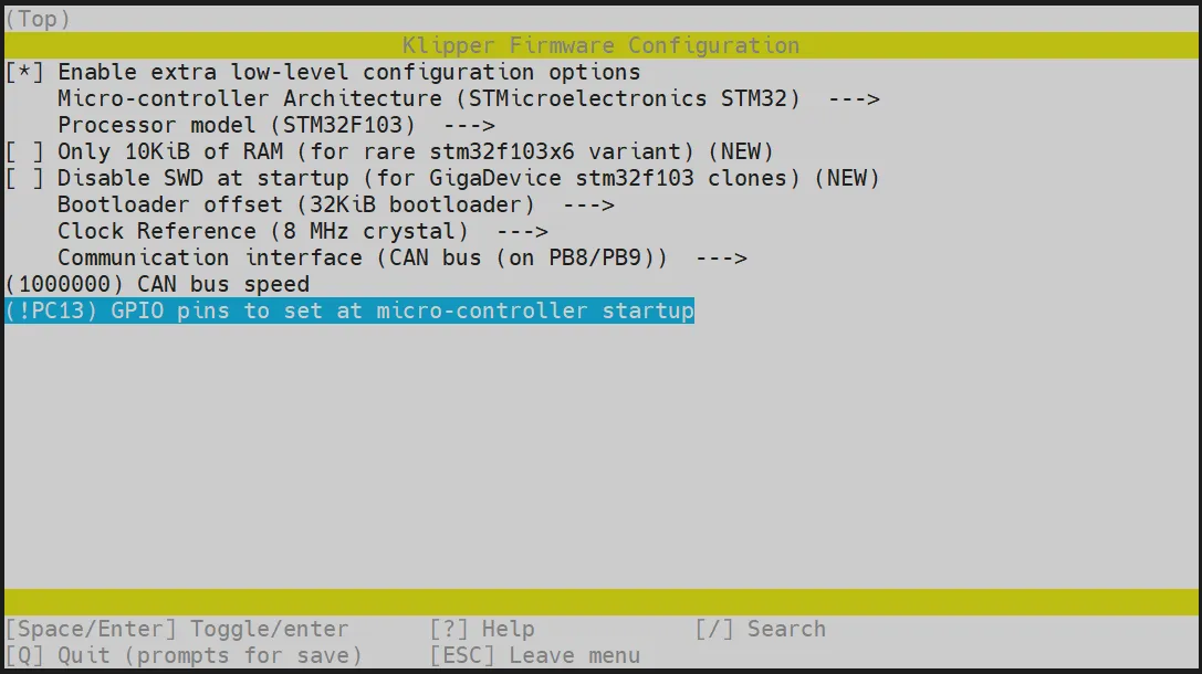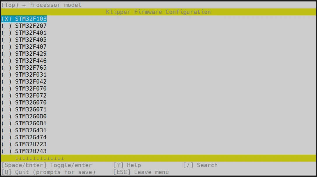 cd ~/klipper && rm -rf ~/klipper/.config && rm -rf ~/klipper/out && make menuconfig