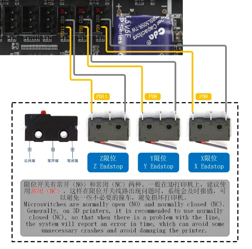 • FLYマザーボードをご利用の方へ: 3線式マイクロスイッチリミットスイッチはFLYマザーボードに直接接続することはできません。マザーボードのリミット端子にはすでに5Vの電源が供給されているため、直接接続すると5Vが短絡し、マザーボードやホストコンピュータ、ドライバなどの機器が破損する可能性があります!