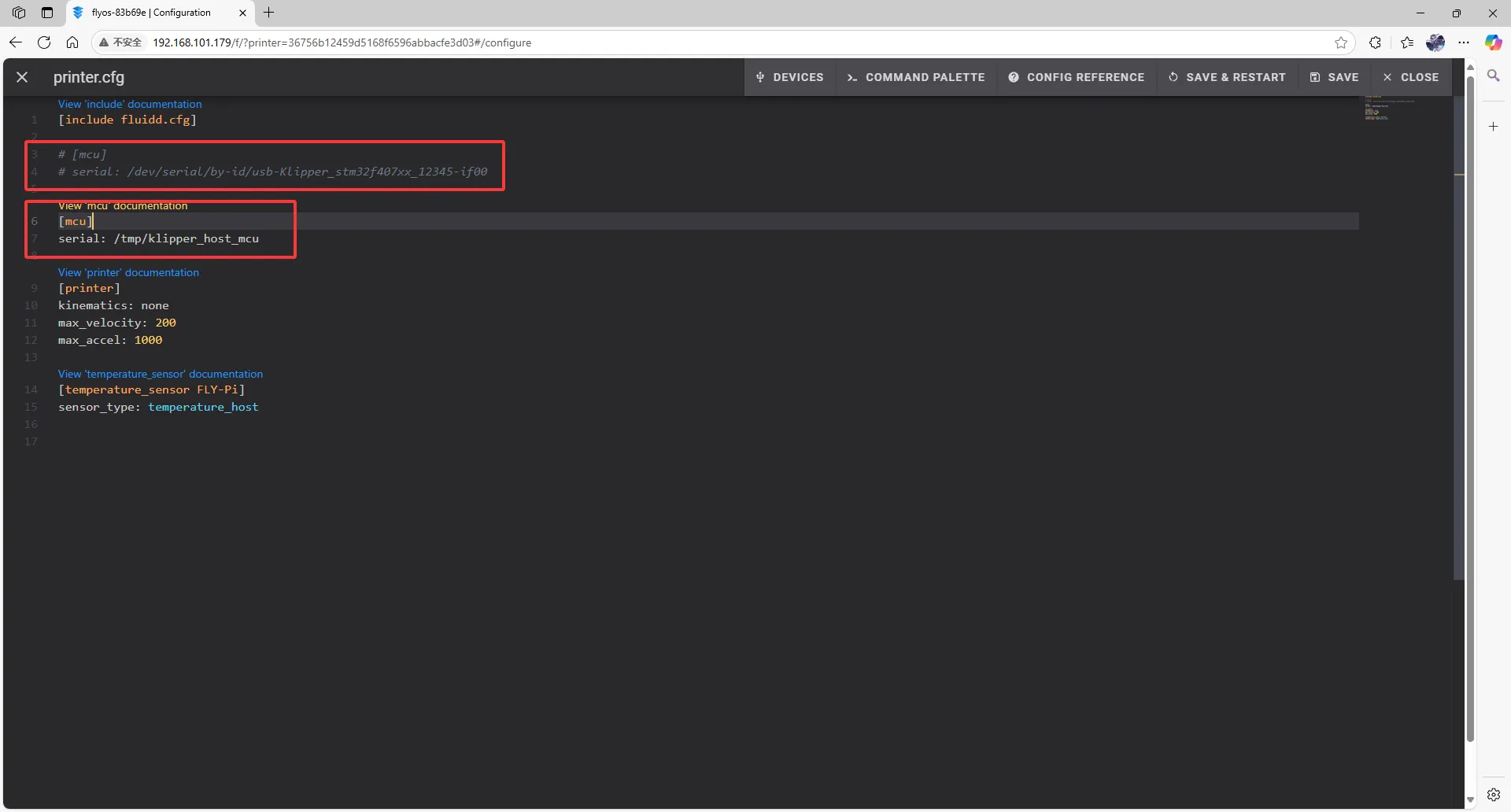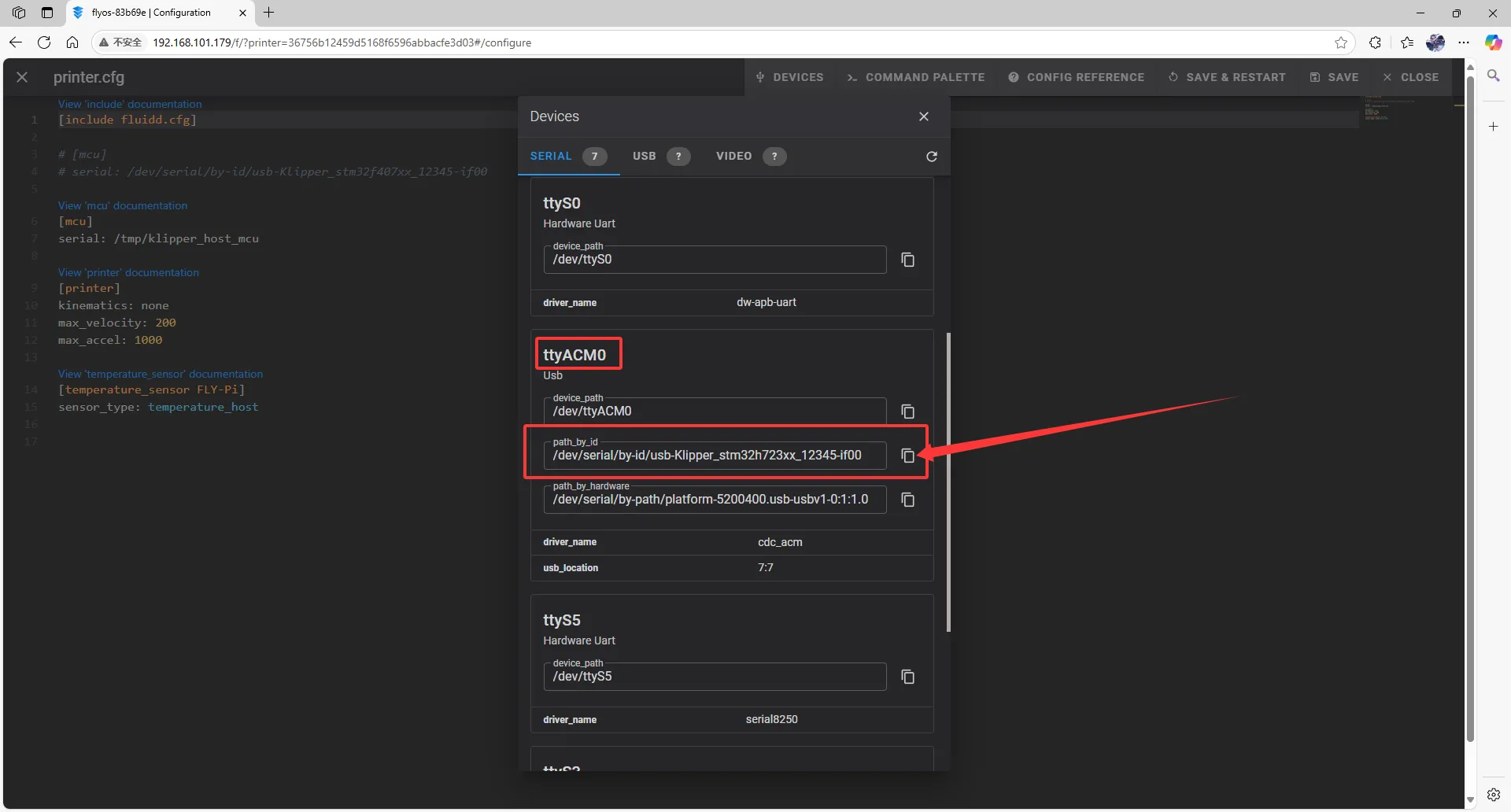 1. printer.cfg をクリックし、次に右上にある DEVICES をクリックします。
