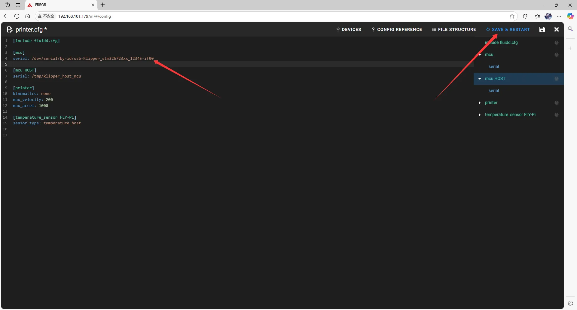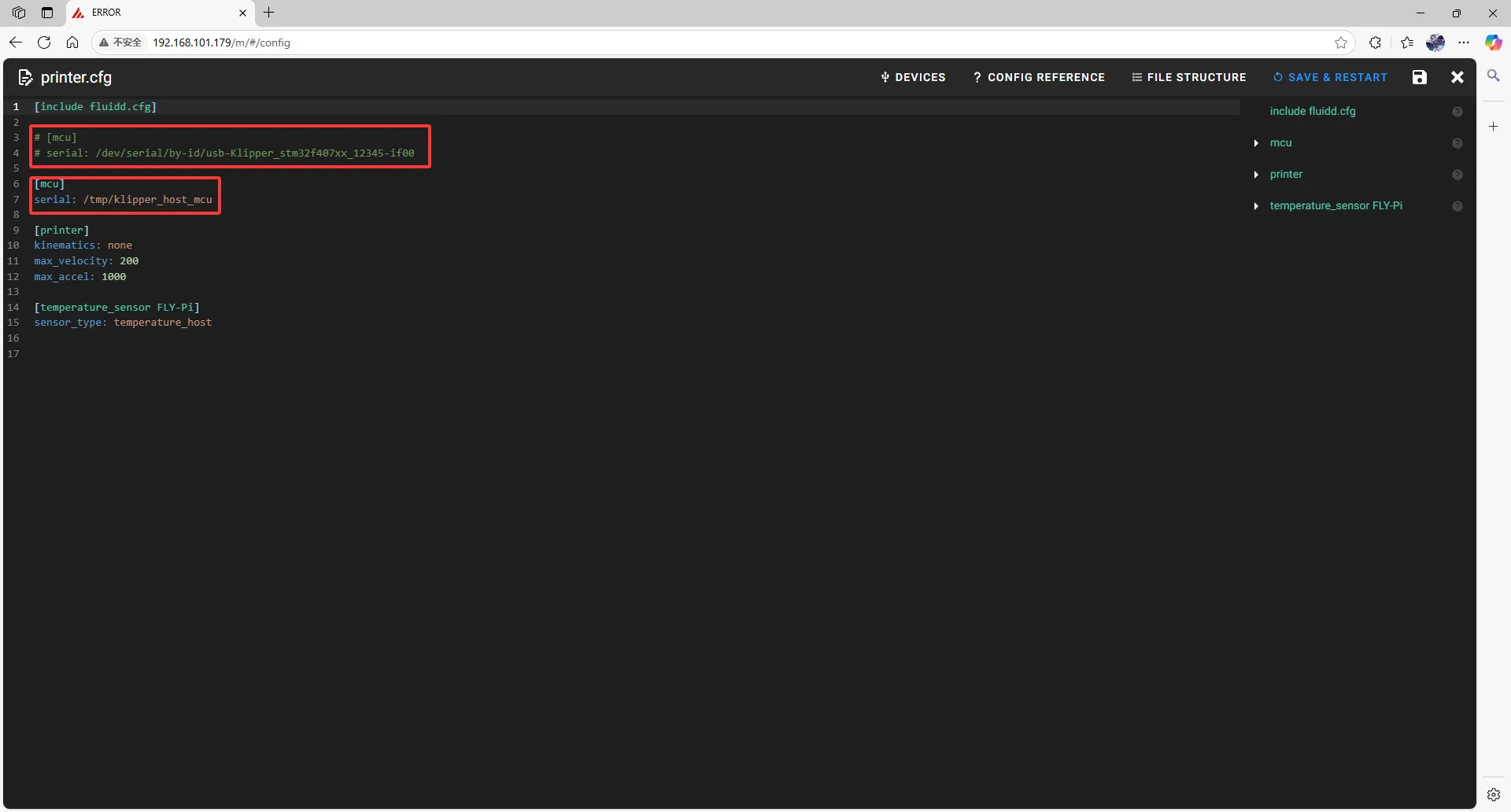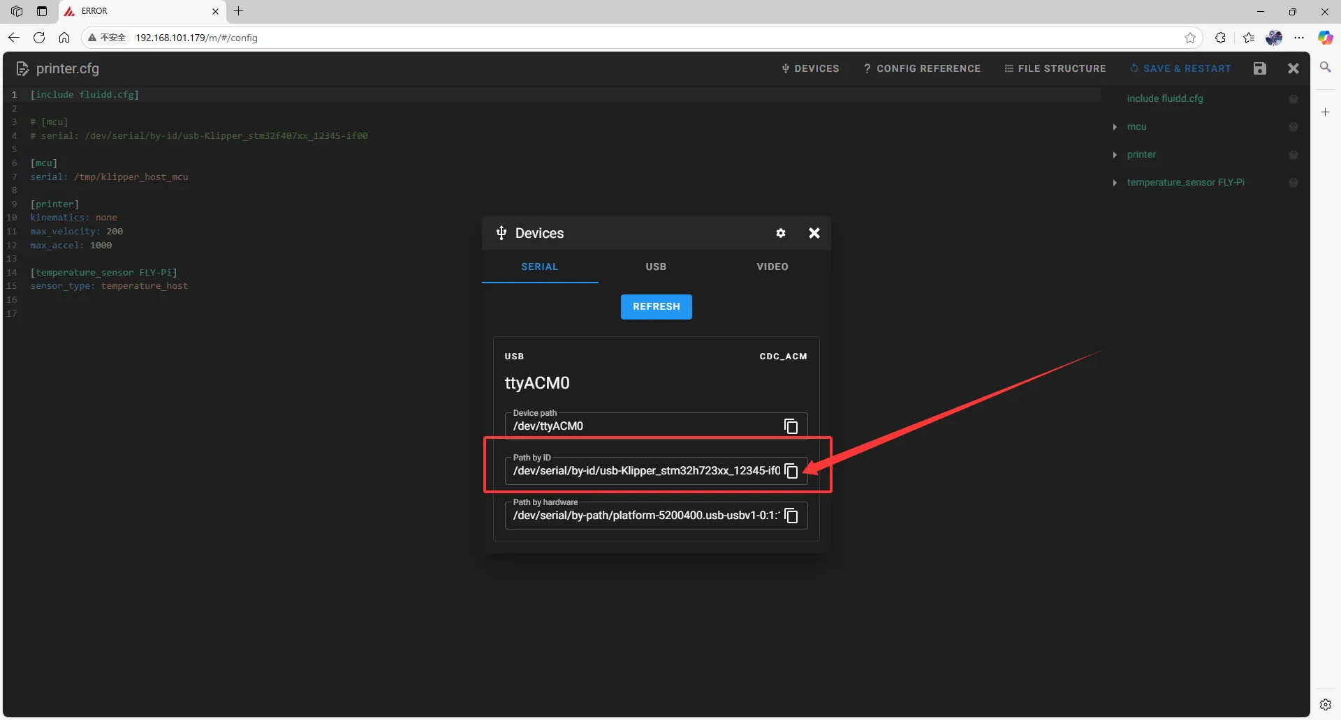• fluiddの場合: {…} をクリックすると printer.cfg が見つかります。