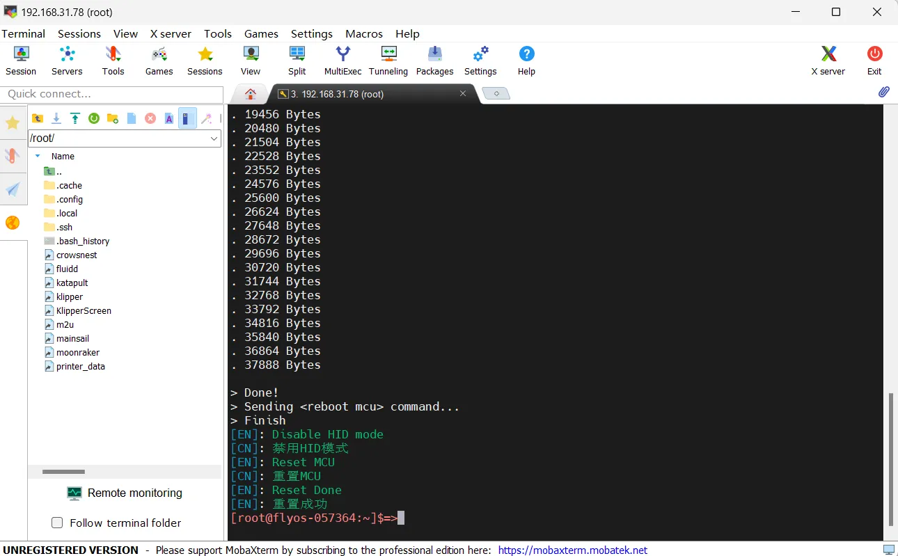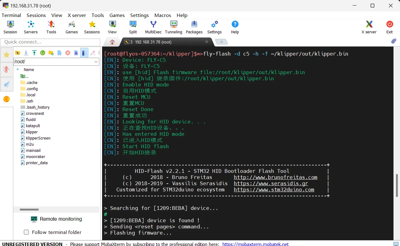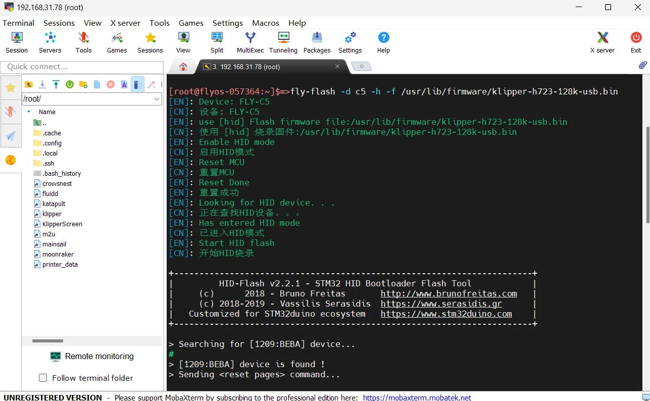 fly-flash -d auto -h -f /usr/lib/firmware/klipper/stm32h723-128k-usb.bin