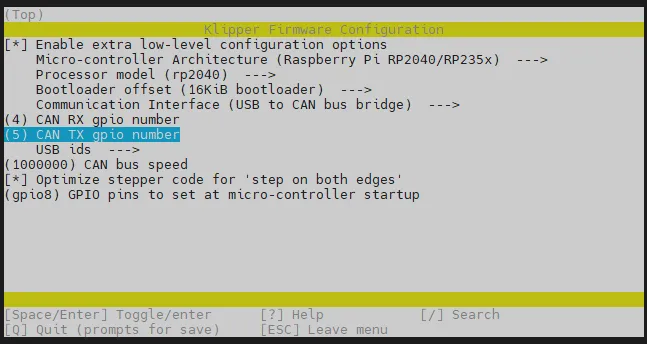 ESCは、一つ前のメニューに戻ります Qキーは、Klipperファームウェアの設定ページを終了しますYキーは、Klipperファームウェアの設定ページを終了する際に、プロンプトがある場合に、Yキーを押して設定ファイルを保存します