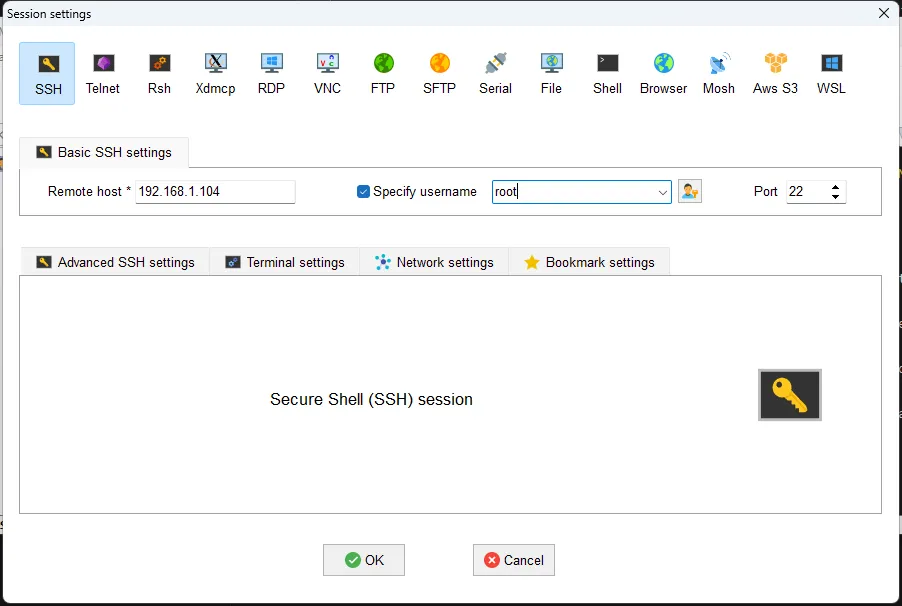 - MobaXtermを開き、以下の設定を行います。IPアドレスは前述したものを入力するか、ルーターの管理画面で確認してください。