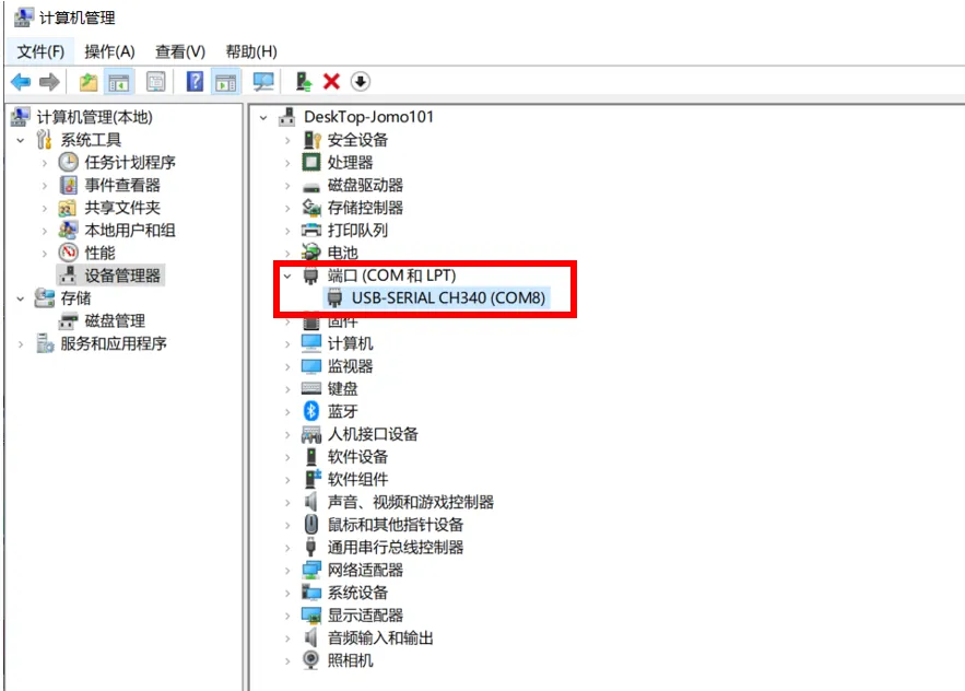 - メインボードがコンピュータに正常に接続されている場合、デバイスマネージャーを開くとCH340のポートが表示されます。