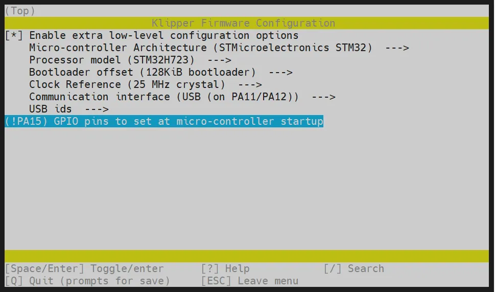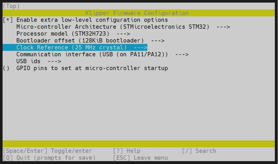 ESCは、一つ前のメニューに戻ります Qキーは、Klipperファームウェアの設定ページを終了しますYキーは、Klipperファームウェアの設定ページを終了する際に、プロンプトがある場合に、Yキーを押して設定ファイルを保存します