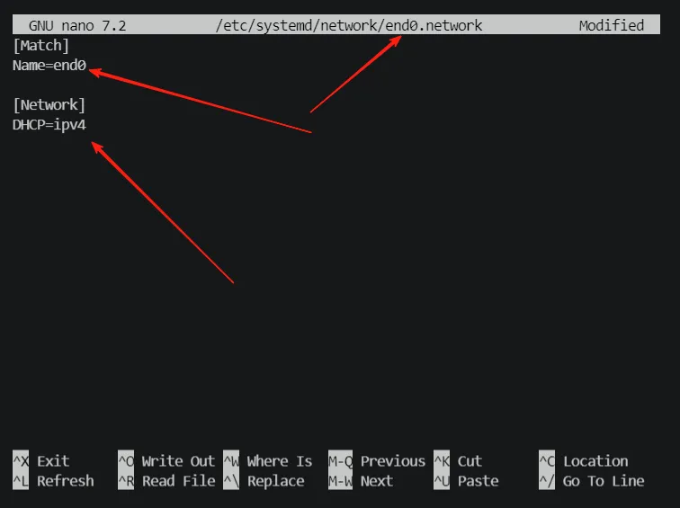 • 명령 실행: nano /etc/systemd/network/end0.network