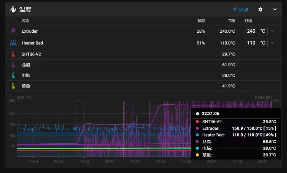 # 온도 목표값이 이미 충분히 낮지만, 노즐 온도가 여전히 높을 수 있습니다.