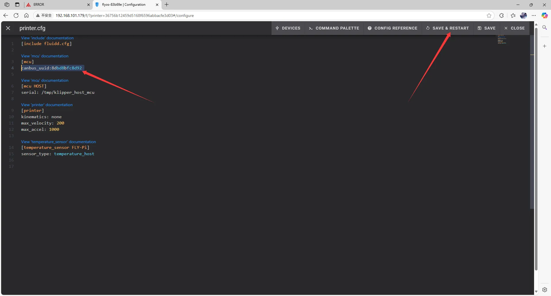 • 오른쪽 상단의 SAVE & RESTART를 클릭하면 자동으로 저장되고 Klipper가 재시작됩니다.