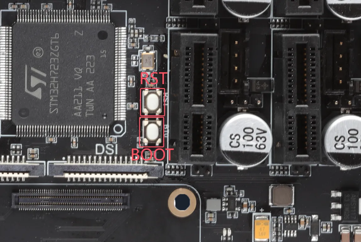- 두 번째 방법: 데이터 전송이 가능한 TYPE-C 케이블을 한쪽 끝은 메인보드에, 다른 쪽은 장치에 연결한 후 BOOT 버튼을 누른 상태에서 RST 버튼을 누르고, 그 다음 RST 버튼을 떼고 BOOT 버튼을 뗍니다.