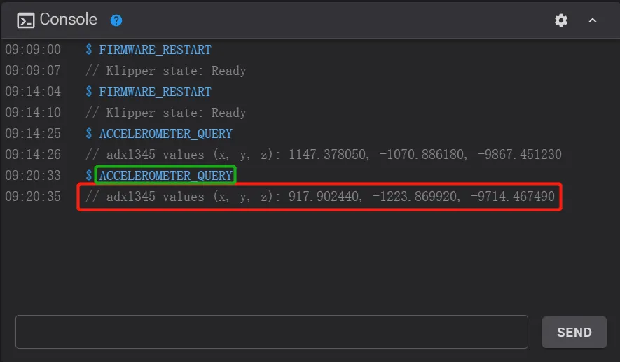 • 여러 개의 가속도계가 연결된 경우 특정 가속도계를 지정하여 테스트할 수 있습니다. ACCELEROMETER_QUERY CHIP=<ADXL>에서 <ADXL>은 실제 가속도계 이름으로 변경하십시오.