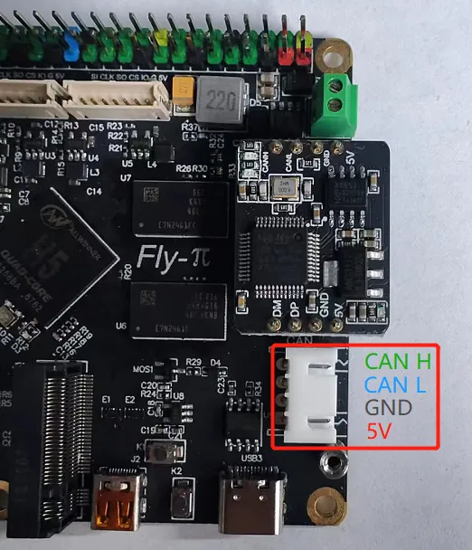 상위 컴퓨터 클래스FLY-Pi보드 내장 CAN HAT 사용이 페이지에서보드 내장 CAN HAT 사용 CAN HAT은 단종되었습니다. 모듈 설치 모듈을 설치하면 하나의 USB 포트를 차지하게 됩니다. 팁모듈을 설치한 후, 아래 그림에 표시된 USB 포트는 더 이상 어떤 장치도 연결할 수 없습니다!!!! Loading...