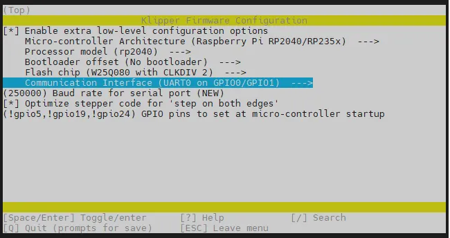 ESC는 상위 메뉴로 돌아갑니다. Q키는 Klipper 펌웨어 구성 페이지를 종료합니다.- Klipper 펌웨어 구성 페이지를 종료할 때