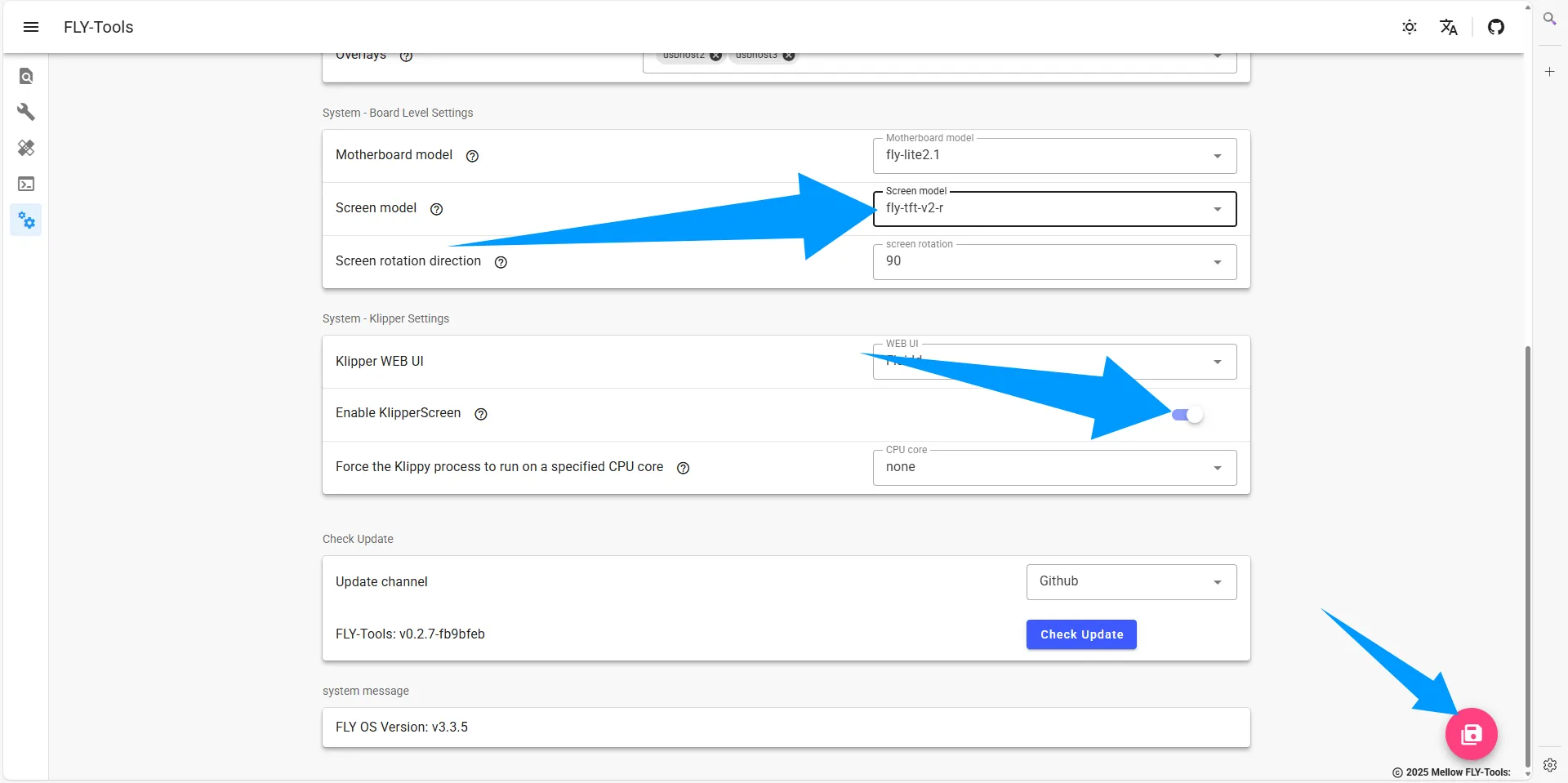 • Для резистивного экрана выберите: fly-tft-v1 или fly-tft-v2-r (убедитесь, что переключатель на обратной стороне экрана установлен в положение Resi)