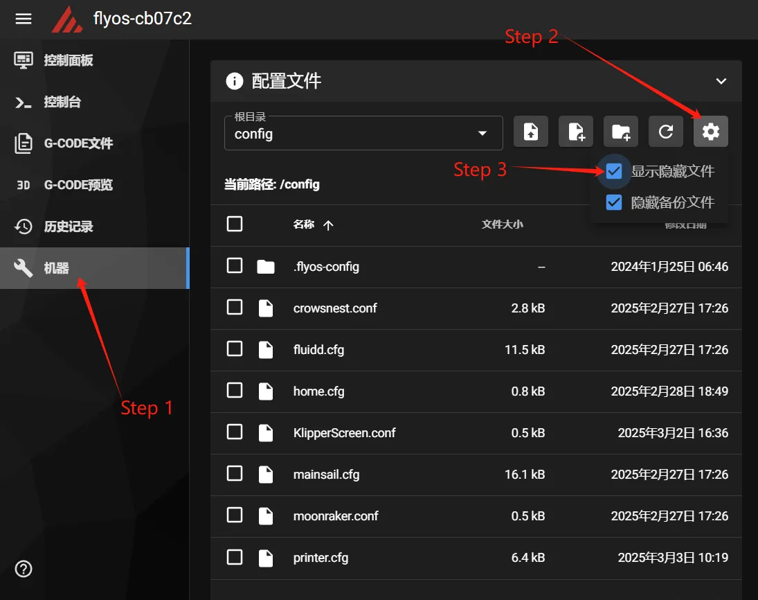 снимите галочкус параметраСкрывать файлы и папки. - В интерфейсе mainsail, как показано справа на рисунке ниже,