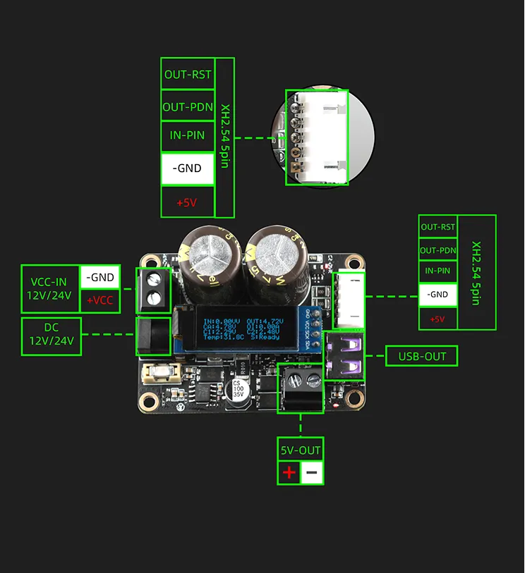 Модуль отключения питания FLY-KPPM разработан специально для плат Raspberry Pi и других разработочных плат с целью обеспечения безопасности данных. Используя передовые технологии, при аварийном отключении питания он автоматически переключается на электролитический источник питания, позволяя разработочной плате стабильно работать в течение 15 секунд, что гарантирует сохранность данных. Компактный размер и простота установки.