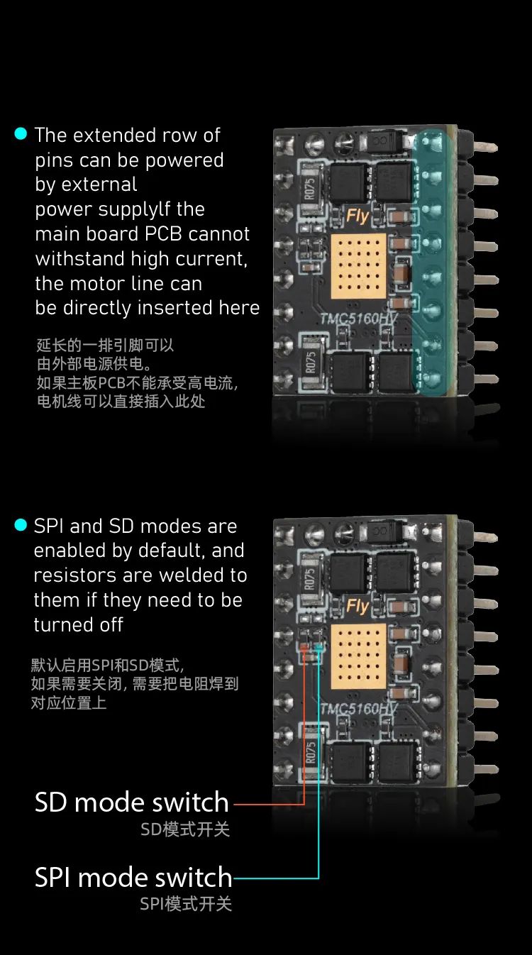- Пины SPI для драйвера FLY находятся на четвертом контакте слева, CS-пин - это пин SPI. Если на плате нет соответствующего контакта, использовать SPI невозможно