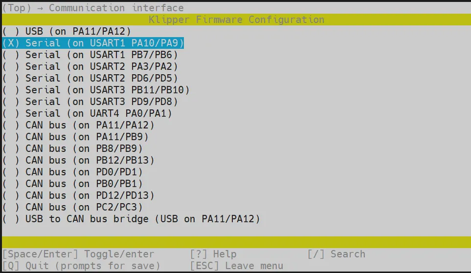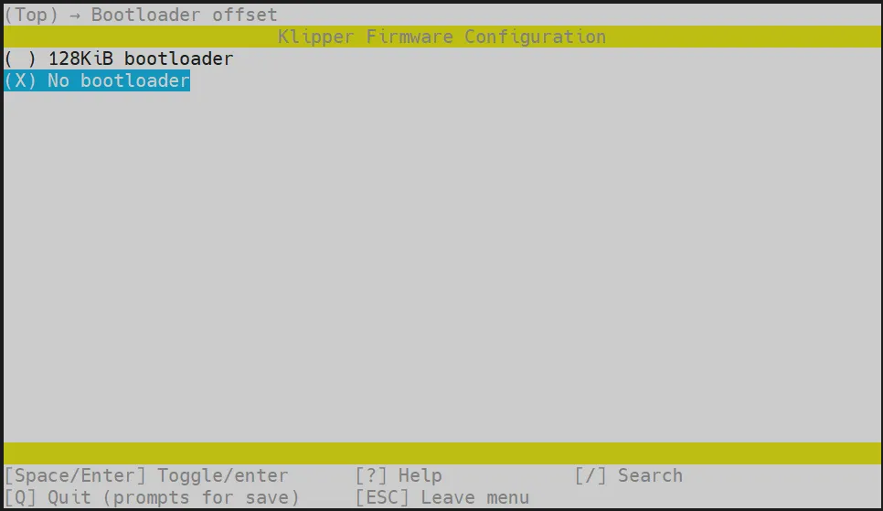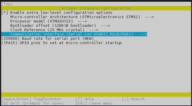 cd ~/klipper && rm -rf ~/klipper/.config && rm -rf ~/klipper/out && make menuconfig -